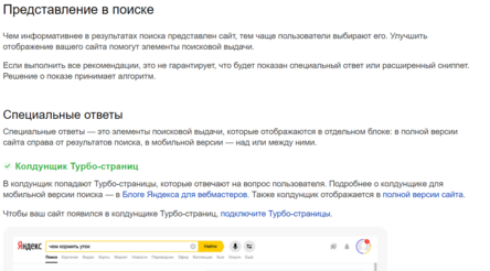Недавно мы добавили новый раздел «Представление в поиске». В нем описаны специальные ответы и расширенные сниппеты, которые делают отображение сайта в результатах поиска информативнее.